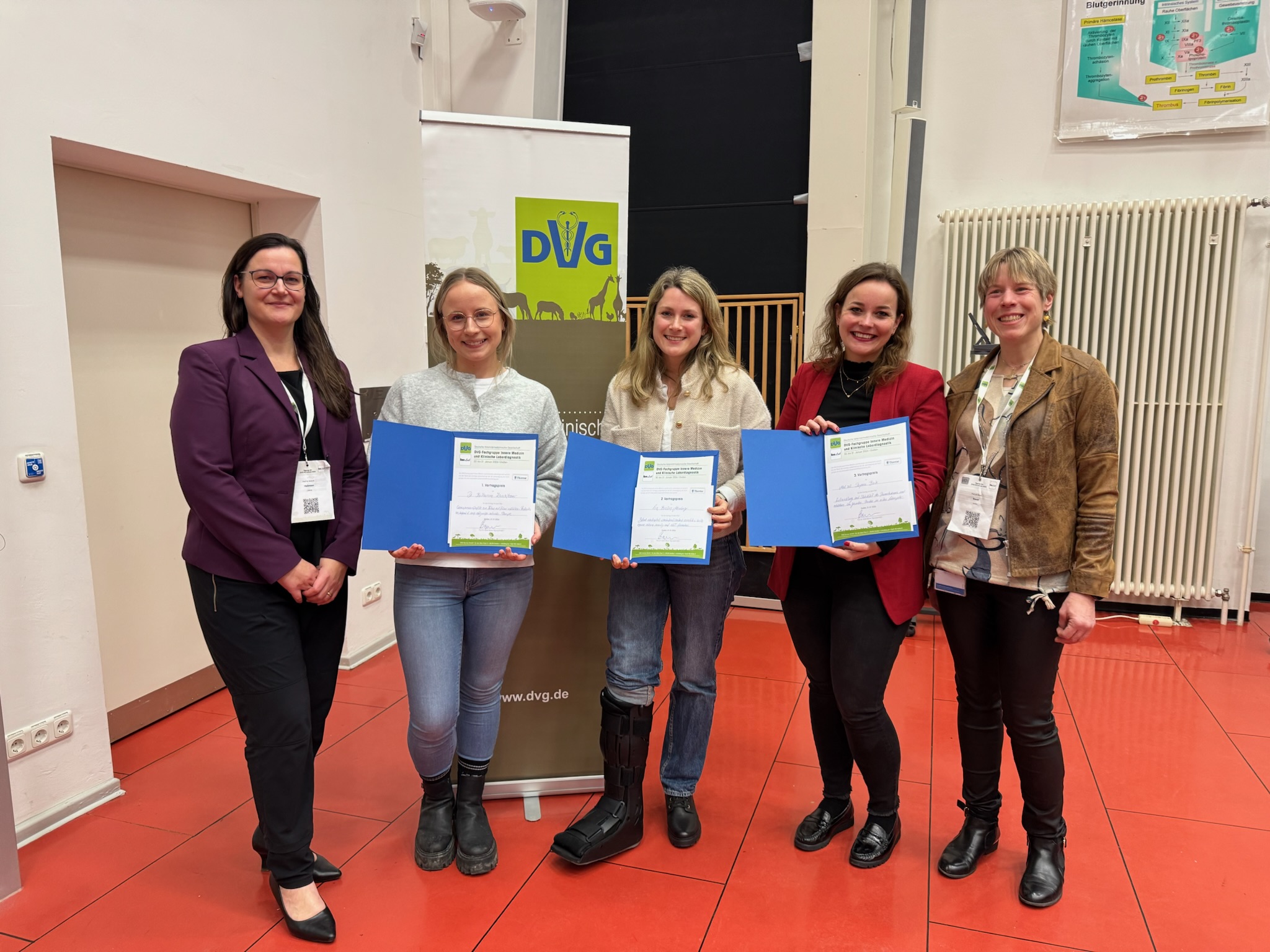 An der 34. Jahrestagung der DVG-Fachgruppe „Innere Medizin und Klinische Labordiagnostik“ (InnLab), die vom 30. - 31. Januar 2026 stattgefunden haben, wurde Dajana Birk mit dem 3. Preis im Rahmen der Doktorierendenvorträge ausgezeichnet. Dajana Birk ist Doktorandin in der Klinik für Kleintiermedizin im Rahmen des «Growing Dog Projects (GDP)» und ihr Vortrag ging um die frühe Entwicklung und Stabilität des Darmmikrobioms und Metabolom-Profils bei gesunden Hunden im ersten Lebensjahr.